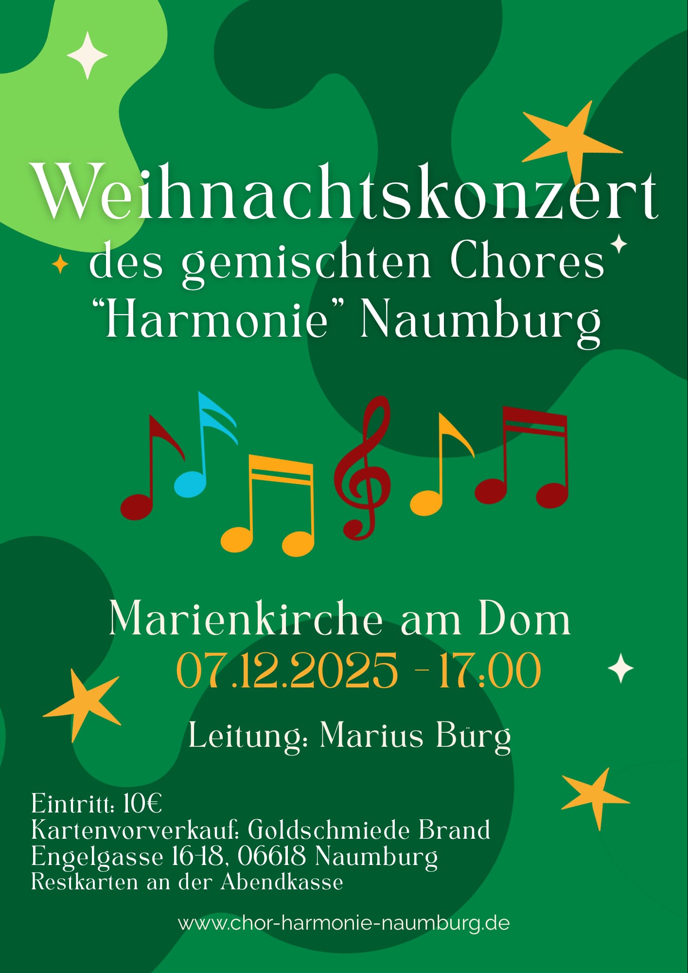 Die nächsten Konzerte des Chores: am 30.11. um 19 Uhr in der Median-Klinik Bad Kösen II und das Weihnachtskonzert am 7.12. um 17 Uhr in der Marienkirche am Dom